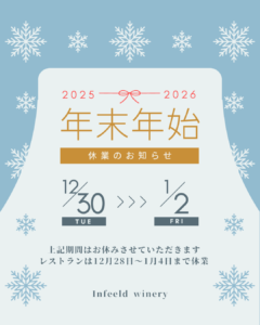 ワイナリーは29日が仕事納めとなり、12月30~1月2日までの間はお休みとなります。